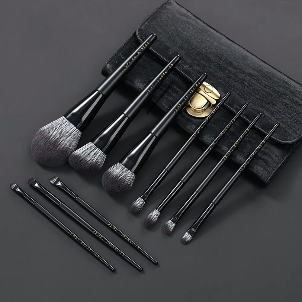 Black Edition Luxe Set of 10 Makeup Brushes with Elegant Gold Clasp Clutch Case